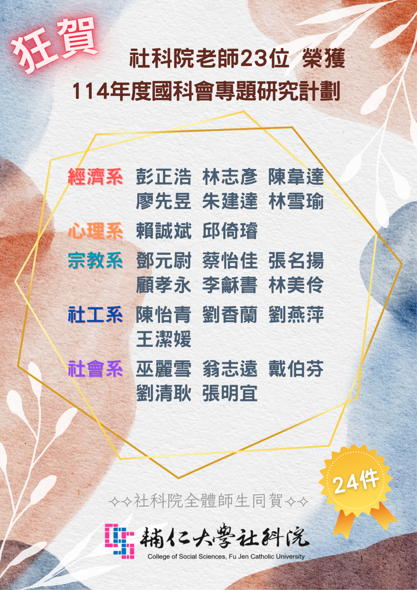 賀:本院23位老師獲【114年度國科會專題研究計畫】