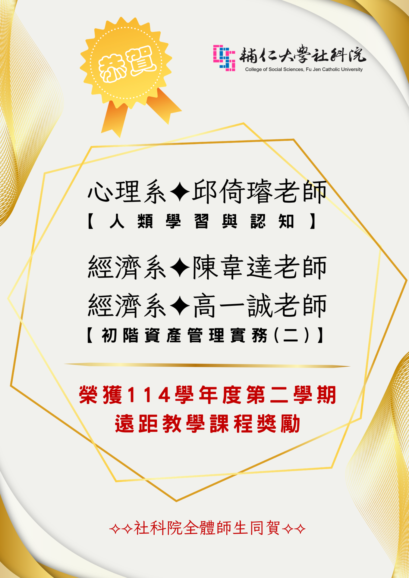 賀:心理系、經濟系老師獲【114-2遠距教學課程獎勵】