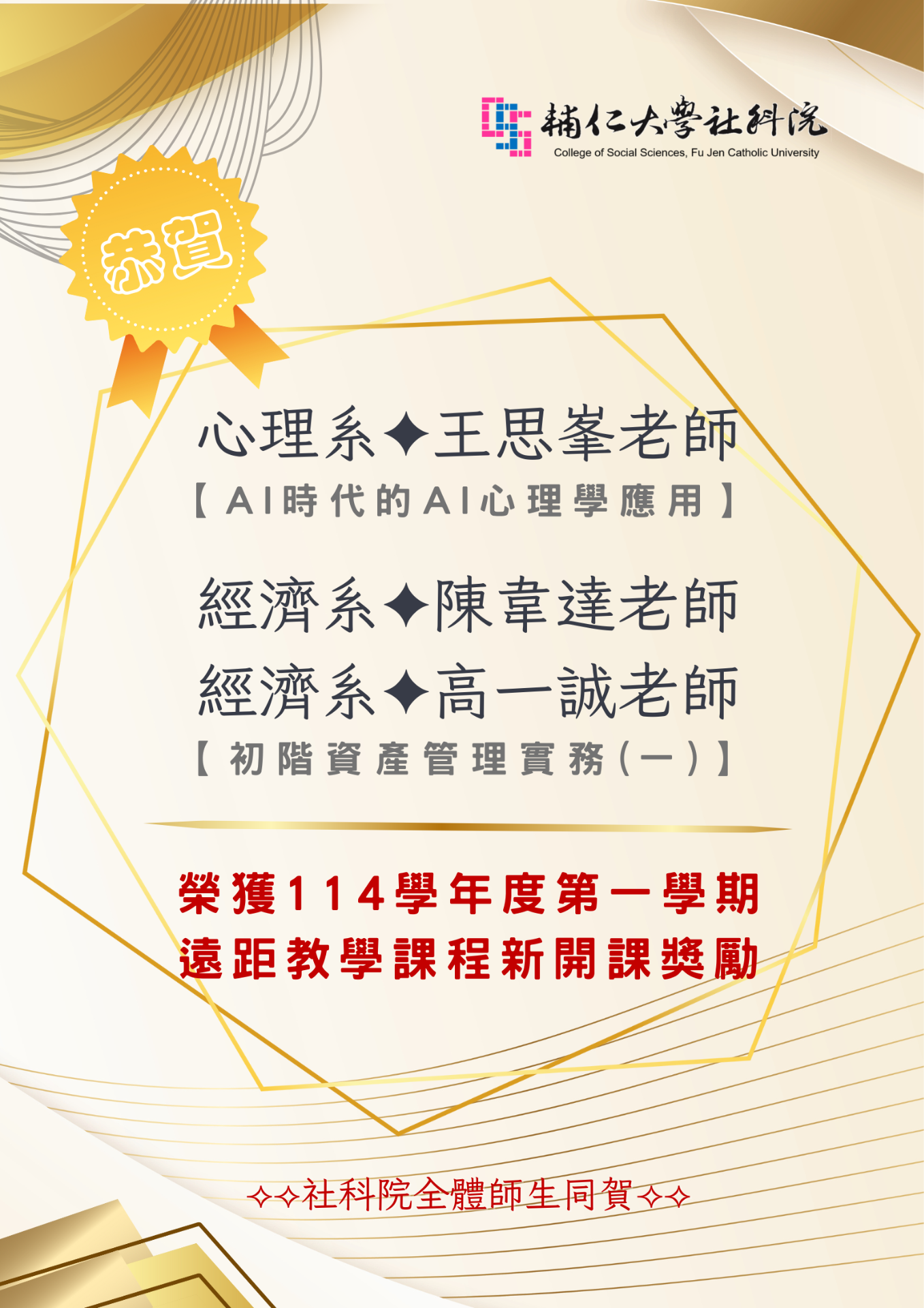 賀:心理系、經濟系老師獲【114-1遠距教學課程新開課獎勵】